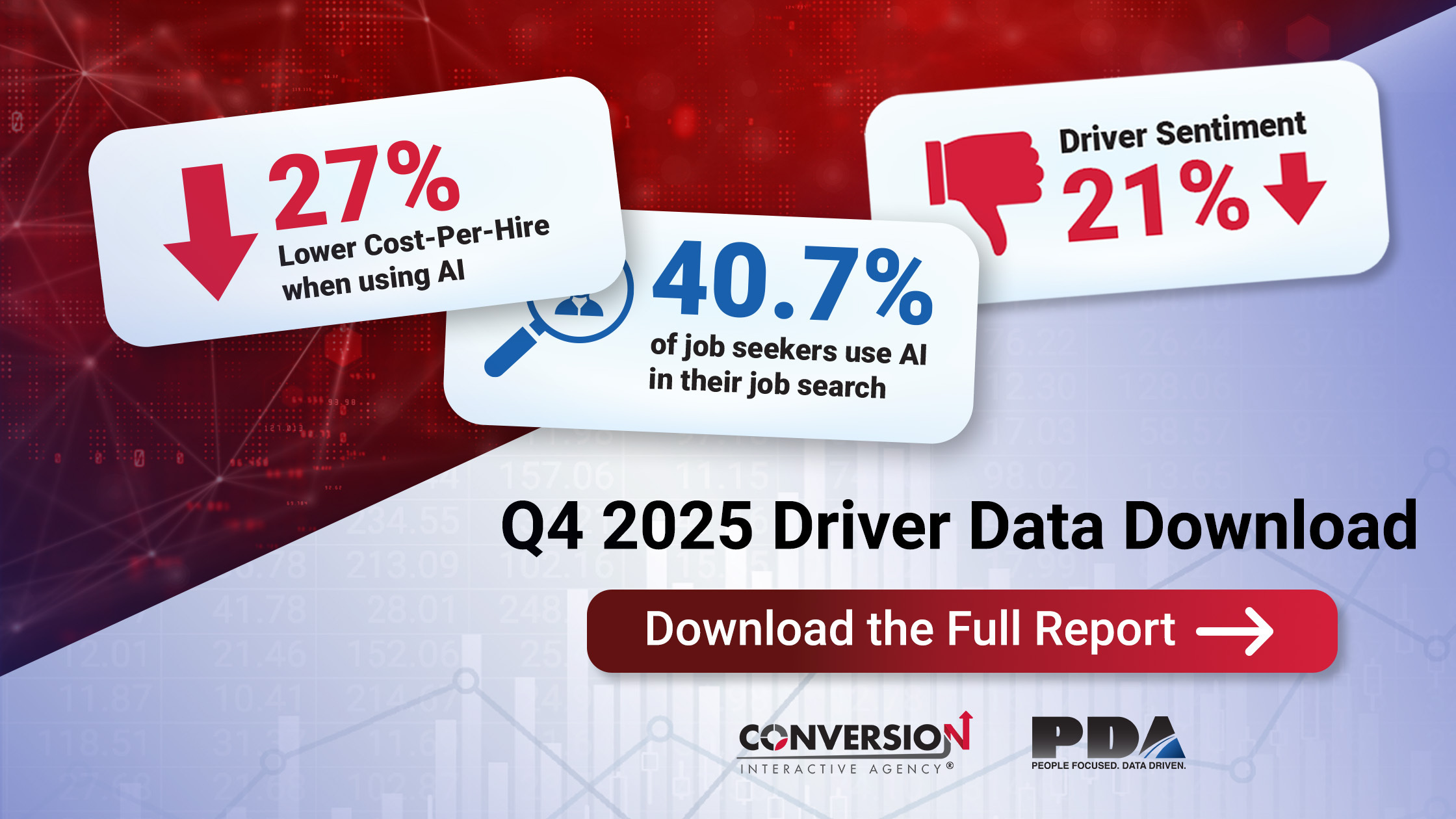 BRENTWOOD, TENN., January 28, 2026 – Conversion Interactive Agency and People. Data. Analytics. (PDA), two leaders in driver recruitment and retention, have released their Q4 2025 Driver Recruiting & Retention Data Download Report, revealing a truck driver market moving into 2026 with intensifying competition for qualified drivers and a priority on outcomes delivered through AI technology.