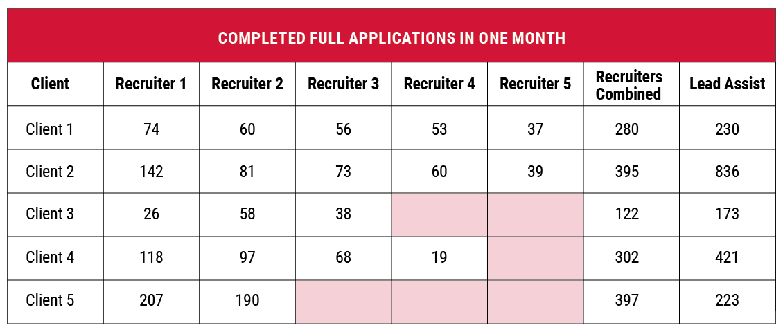 - Client 2: Lead Assist completed 836 applications, compared to the highest-performing recruiter at 142 applications—nearly six times more.